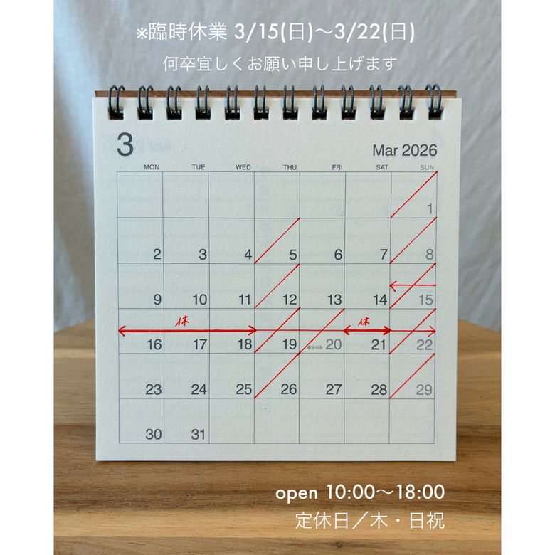 誠に勝手ながら、3/15(日)〜3/22(日)の期間を臨時休業とさせていただきます。